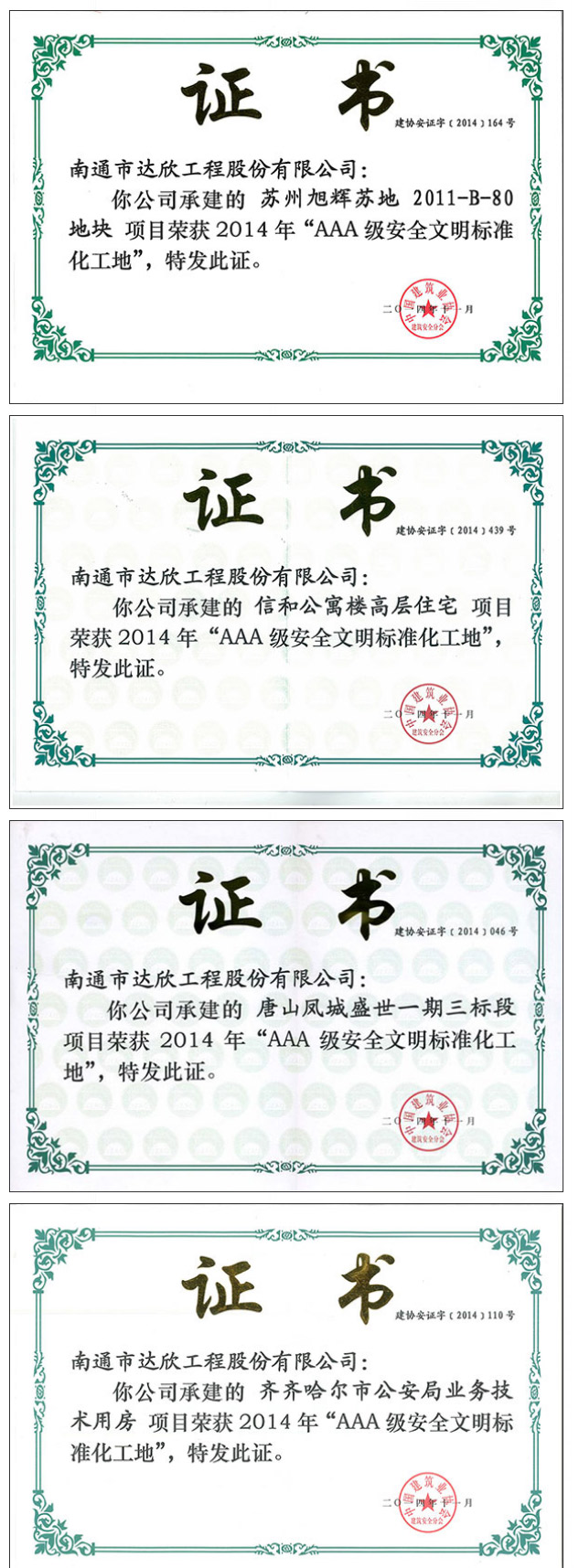 近幾年我公司獲得全國AAA級安全文明標(biāo)準(zhǔn)化工地16項(xiàng),創(chuàng)建面涉及上海、江蘇、湖南、河北、黑龍江、新疆等市場,安全文明施工管理水平再上新臺階,榮譽(yù)的取得為進(jìn)一步提升達(dá)欣品牌在全國各個(gè)市場的影響力,為進(jìn)一步提升企業(yè)形象、促進(jìn)企業(yè)長遠(yuǎn)發(fā)展奠定堅(jiān)實(shí)的品牌基礎(chǔ)。