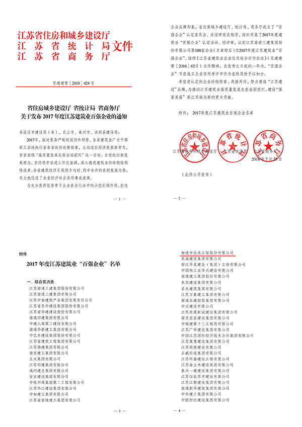 江蘇建筑業(yè)“百強企業(yè)”是由省建設廳、省統(tǒng)計局、省商務廳成立的“百強企業(yè)”認定委員會評議認定,從企業(yè)營業(yè)額等經(jīng)濟類指標、質(zhì)量安全、技術(shù)創(chuàng)新指標等方面進行綜合評定,旨在充分發(fā)揮優(yōu)勢企業(yè)在全行業(yè)中的引領和示范作用,打造建筑企業(yè)品牌,提升核心競爭力,是權(quán)威性的政府評選。同時按照《江蘇省建筑業(yè)企業(yè)信用綜合評價辦法》(蘇建建管〔2016〕82號)文件精神,自發(fā)布之日起的一年內(nèi),“百強企業(yè)”可在施工企業(yè)信用考評中作為省級獎勵予以加分。