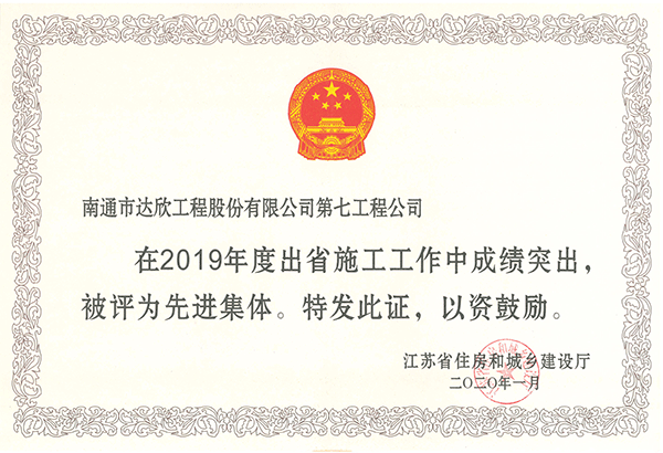 江蘇省住房和城鄉(xiāng)建設(shè)廳公布了“2019年度江蘇出省施工企業(yè)先進(jìn)集體和先進(jìn)個人的通報”。第七工程公司榮獲“2019年度江蘇出省施工企業(yè)先進(jìn)集體”,陳貴榮同志被評為“江蘇出省施工先進(jìn)個人”。
