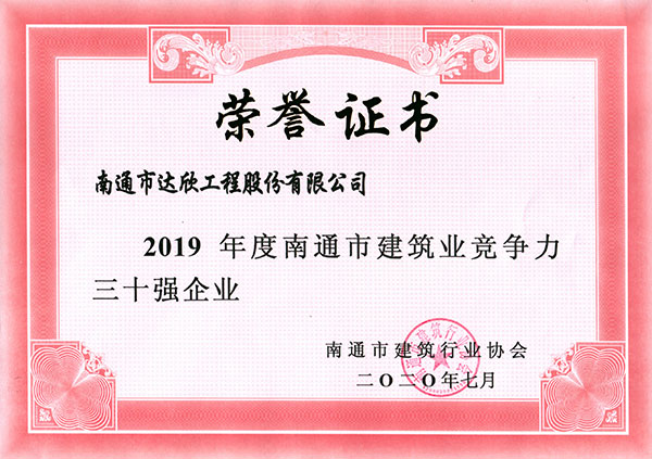 根據(jù)《關(guān)于開展2019年度南通市建筑業(yè)“雙三十強”及“三優(yōu)”評價工作的通知》(通建協(xié)〔2020〕2號),經(jīng)評審委員會對“雙三十強”企業(yè)及“三優(yōu)”初審結(jié)果進(jìn)行復(fù)核、審查,最終公司獲得2019年度南通市建筑業(yè)競爭力三十強企業(yè),評價排名第11位,馬和軍同志獲得南通市建筑業(yè)優(yōu)秀企業(yè)家,楊靜同志獲得南通市建筑業(yè)優(yōu)秀企業(yè)經(jīng)理。