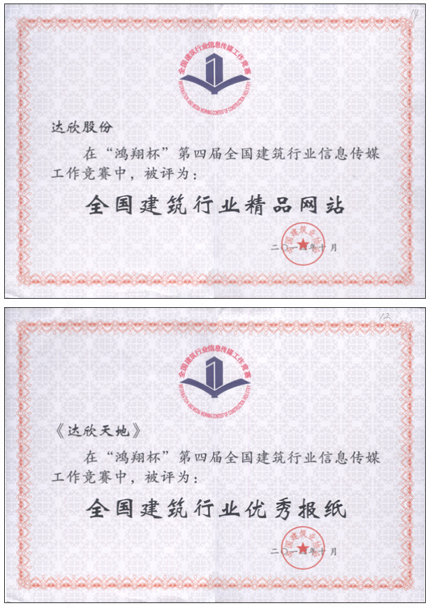 青海省建筑業(yè)協(xié)會副會長兼秘書長許光科致辭。中國建筑業(yè)協(xié)會副秘書長趙峰講話。江蘇省建筑市場管理協(xié)會會長汪士和、浙江省建筑行業(yè)協(xié)會副會長吳漢忠等領(lǐng)導(dǎo)出席了會議。會上向“鴻翔杯”第四屆全國建筑行業(yè)信息傳媒工作競賽的優(yōu)勝者頒發(fā)牌證?!斑_欣股份”企業(yè)網(wǎng)站榮獲全國建筑行業(yè)精品網(wǎng)站、 “達欣天地”企業(yè)報紙榮獲全國建筑行業(yè)優(yōu)秀報紙。