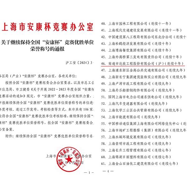 日前,上海市“安康杯”競賽辦公室滬工安【2024】3號(hào)文件,對獲得2022-2023年全國“安康杯”競賽優(yōu)勝單位榮譽(yù)的集體進(jìn)行通報(bào),達(dá)欣集團(tuán)連續(xù)十年被評為全國“安康杯”競賽優(yōu)勝單位。