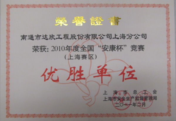 會上還對“安康杯”競賽活動的先進集體與個人進行了表彰。第一工程公司“安康杯”競賽活動工作的有效開展,得到了上海市總工會、上海市安全生產(chǎn)監(jiān)督管理局、上海市建交委、江蘇省駐滬辦的充分肯定,為此被評為2010年全國“安康杯”競賽(上海賽區(qū))優(yōu)勝單位(受此表彰的外省市進滬施工企業(yè)僅此三家),這也是第一工程公司連續(xù)三年獲此榮譽。