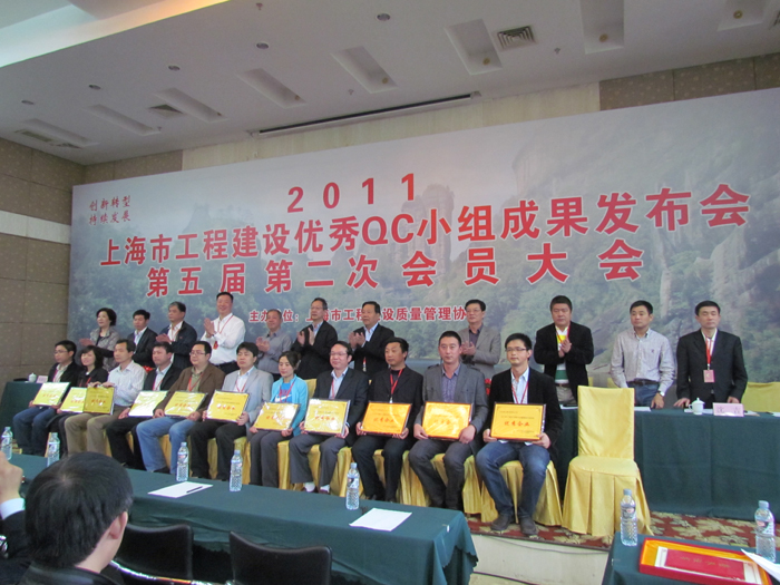 4月17日上海市工程建設(shè)質(zhì)量管理協(xié)會(huì)召開(kāi)2011年建設(shè)工程優(yōu)秀QC小組活動(dòng)成果發(fā)布會(huì)暨第五屆第二次會(huì)員大會(huì)。第一工程公司選送的 “攻克3m厚大體積砼底板裂縫”、“提高施工現(xiàn)場(chǎng)安全達(dá)標(biāo)優(yōu)良率”、“推行‘四節(jié)一環(huán)?!行Ы档凸こ坛杀尽薄ⅰ疤岣呓ㄖ粔こ痰氖┕べ|(zhì)量”、“有效控制填充墻內(nèi)混凝土構(gòu)造柱裂縫”、“有效控制斜屋面混凝土施工質(zhì)量”、“提高YTONG砂加氣砼砌塊砌筑合格率”、“有效提高模板工程施工質(zhì)量”、“降低明珠城三期工程鋼筋損耗”等九項(xiàng)QC成果均參加本次活動(dòng)的發(fā)布與交流。這次江蘇省在滬企業(yè)參加QC成果發(fā)布、交流共83篇,我公司就占據(jù)其中的14%,得到了駐滬辦領(lǐng)導(dǎo)的充分肯定。工程公司也被上海市工程建設(shè)質(zhì)量管理協(xié)會(huì)評(píng)為2011年上海市建設(shè)質(zhì)量管理小組活動(dòng)優(yōu)秀企業(yè)。
