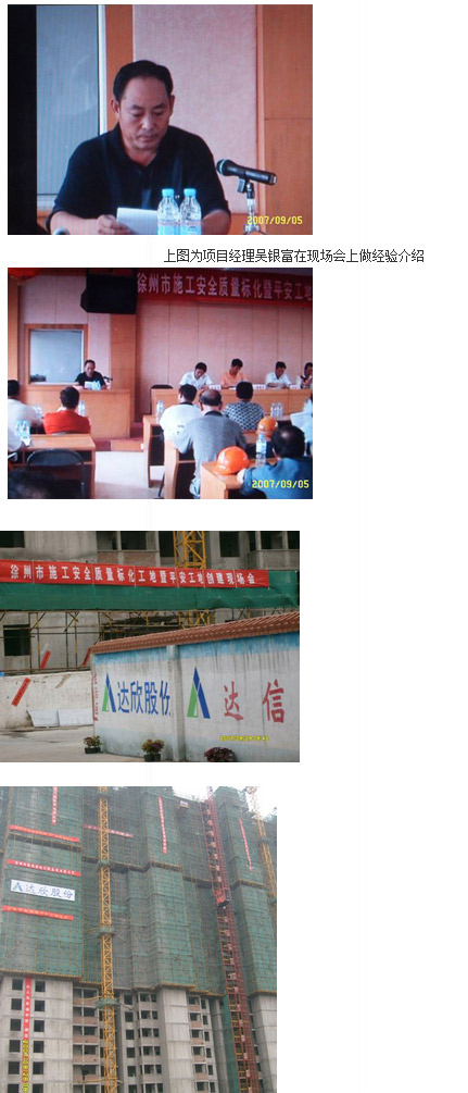 大會上吳經(jīng)理的發(fā)言得到了大家一次又一次的掌聲,建設局安監(jiān)處王處長最后對這次的現(xiàn)場會作了很高的評價。通過這一次的活動,極大的提高了“達欣股份”在徐州建筑市場的知名度,為“達欣股份”進軍強手之林奠定了基石,提升了我們的品牌形象。