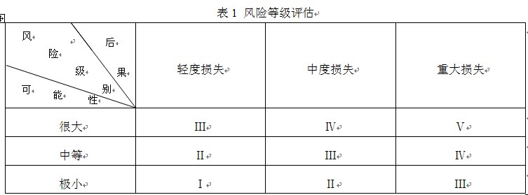 在對危險(xiǎn)源識(shí)別的基礎(chǔ)上,評(píng)估危險(xiǎn)源造成風(fēng)險(xiǎn)可能性和大小,對風(fēng)險(xiǎn)進(jìn)行分級(jí),對不同等級(jí)風(fēng)險(xiǎn)采用相應(yīng)的風(fēng)險(xiǎn)控制措施。風(fēng)險(xiǎn)等級(jí)評(píng)估:Ⅰ級(jí)為可忽略風(fēng)險(xiǎn);Ⅱ級(jí)為可接受風(fēng)險(xiǎn);Ⅲ級(jí)為中度風(fēng)險(xiǎn);Ⅳ級(jí)為重大風(fēng)險(xiǎn);Ⅴ級(jí)為不容許風(fēng)險(xiǎn),如表1。