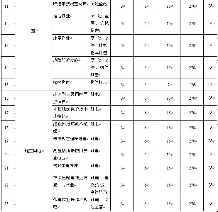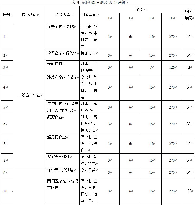 本公司目前在建的主要工程有:重慶直升機(jī)投資有限公司項(xiàng)目(包括總裝廠房、交付中心和教學(xué)大樓),重慶機(jī)床集團(tuán)搬遷項(xiàng)目(包括廠房、科技大樓、倒班宿舍)。公司針對兩個(gè)施工現(xiàn)場特點(diǎn)進(jìn)行分析,制訂了危險(xiǎn)源識(shí)別及風(fēng)險(xiǎn)評(píng)價(jià)表,部分內(nèi)容如表3。