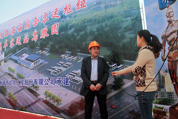 在開工儀式后,馬董事長現(xiàn)場接受了海安電視臺的采訪,代表公司向全縣人民承諾,要把本項(xiàng)目作為公司的重點(diǎn)工程、形象工程展示給全縣人民,做到抓質(zhì)量精益求精,抓進(jìn)度一絲不茍,抓安全防微杜漸,以一流的素質(zhì),一流的服務(wù),一流的技術(shù),打造出優(yōu)質(zhì)的精品工程回饋家鄉(xiāng)人民。
